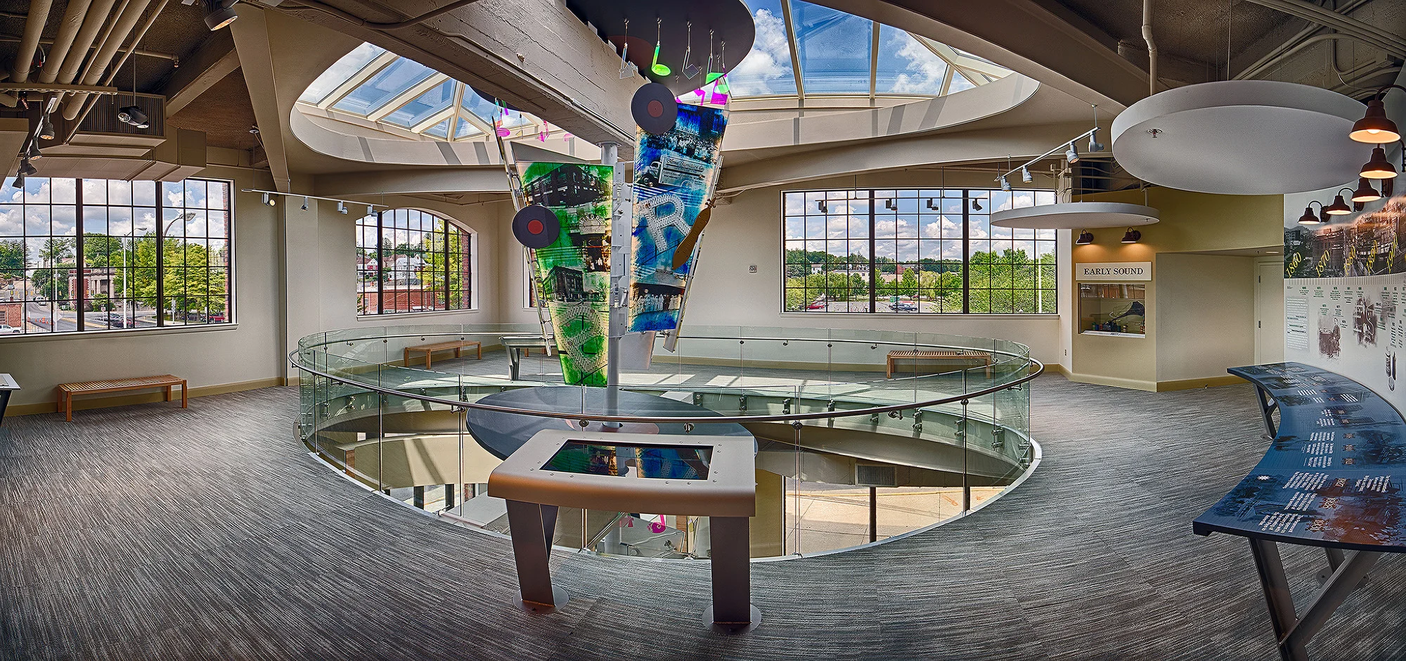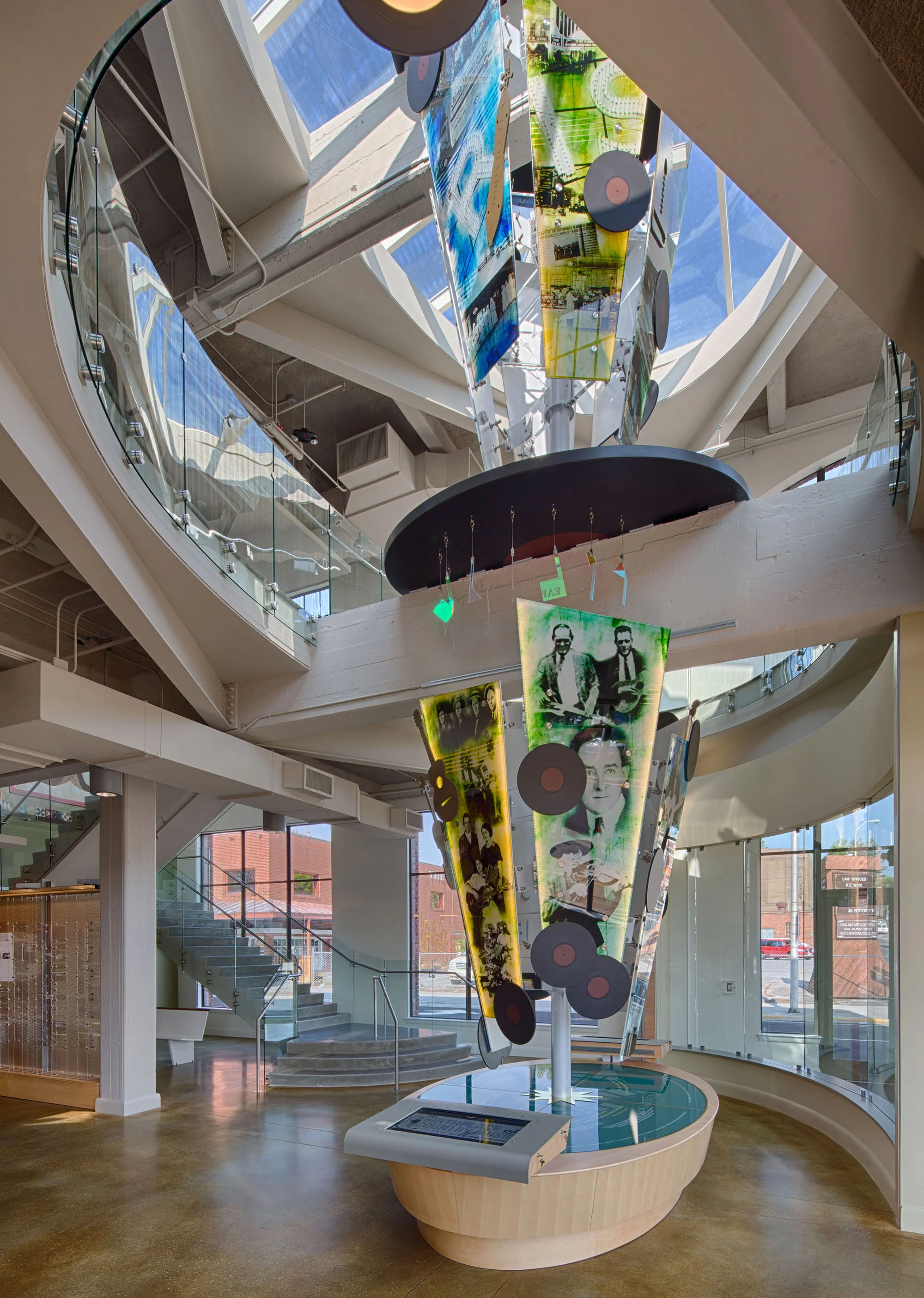 The challenge of this adaptive-reuse project lies in how the impact and story of the Bristol Sessions is conveyed to the public. The design team strived for exhibits that deliberately engage visitors in a spatial experience that seamlessly integrate both the building’s industrial architecture with its interpretative exhibits. Initially greeted by a two-story thematic structure, entering guests are immediately captivated by twelve “singing” sound-driven LED graphic panels and two nine-foot diameter records perched on “flying” concrete girders. Featuring clear acrylic beams and heavy-duty spider fittings, this structure hovers through the oval-shaped opening onto the skylight above. As patrons move through the second floor permanent galleries, exhibits are enriched with various mini and wide-angled immersive theaters, interactive touch-screen reader rails, music mixing and listening consoles, and even an enclosed sing-a-long karaoke booth. Highlights also include a holy music chapel recreation that shows the importance of family and religion in the Appalachia, and a live working radio station.